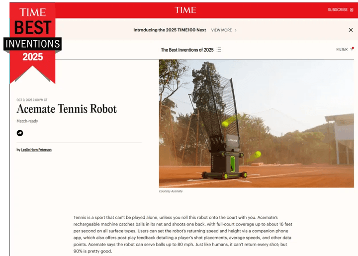 - Acemate: Launched in 2025, Acemate is the world’s first AI-powered tennis robot, acclaimed by TIME magazine as one of the Best Inventions of 2025. It achieved remarkable success in overseas crowdfunding, raising over 16.5 million RMB-76 times its initial target-by delivering highly accurate and responsive tennis rallies.